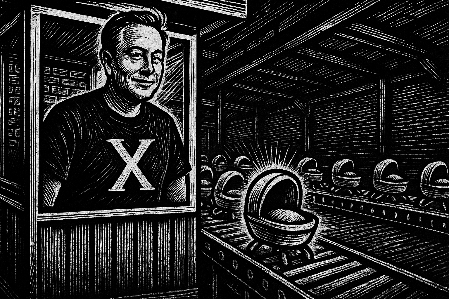 As the cradles continue forward, the darkness behind them slowly recedes. What lies ahead is a space prepared for arrival. These metal children carry no memories, no intent, only the outline of lives waiting to unfold.